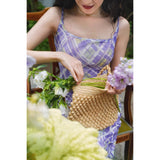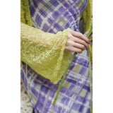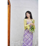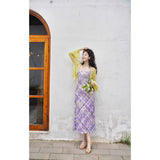 菫の花のような鮮やかなパープルのチェック柄があしらわれたロング丈のキャミソールワンピース。肩紐は長さ調整可能なデザインで、ウエストラインは控えめに絞られており、肋骨のすぐ下から自然に切り替わる設計となっています。ボディラインに優しく沿うタイトめのシルエットで、女性らしさを引き立てます。スクエアネックと細めの肩紐が、デコルテと肩の美しさを際立たせ、ナチュラルで上品な印象に。