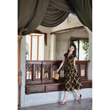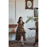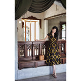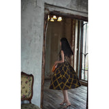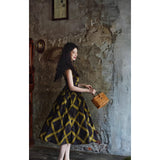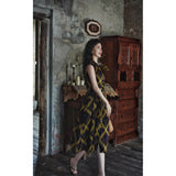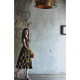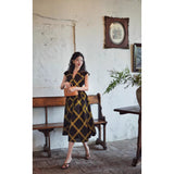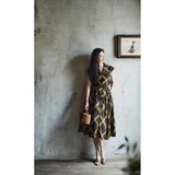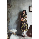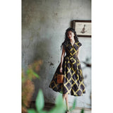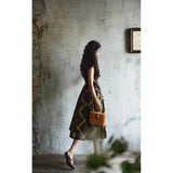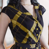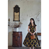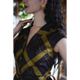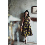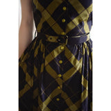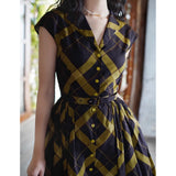 1980年代を彷彿とさせる斜めチェック柄のクラシックワンピース。ダークブラウンとオリーブの組み合わせが印象的。袖は短めのフレンチスリーブで、ボタンダウンのデザインとなっており、Vネックが首元を美しく見せ、施されたベルトでウエストマークされています。フレアに広がるスカート部分が上品な雰囲気を醸し出しています。