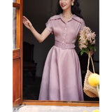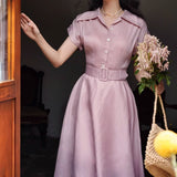 1960年代の映画のヒロインみたいに演出してくれるワンピース。ふわりと風をはらむ軽やかなシルエット。大きめの襟と艶やかなボタンがクラシックな表情を演出し、ワイドベルトがウエストを引き締めてくれる。動くたびに優雅な余韻を残します。