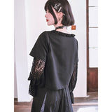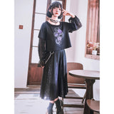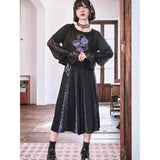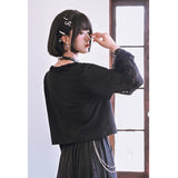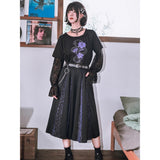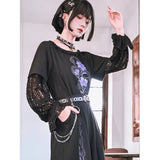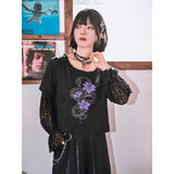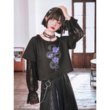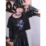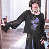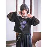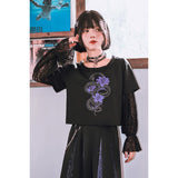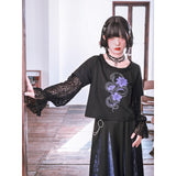 漆黒の生地に浮かび上がるのは、妖艶な紫の百合と絡み合う蛇。短め丈のトップスに、襟元を縁取る控えめなフリルがさりげない可憐さを添え、袖には透け感のあるレースを重ねてゴシックな陰影を演出しています。花と蛇が織りなすモチーフは、静かな美しさと鋭い存在感を併せ持ち、甘さと毒気が同居するような独特の雰囲気を放っています。