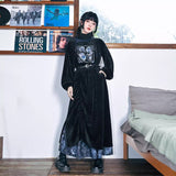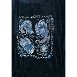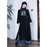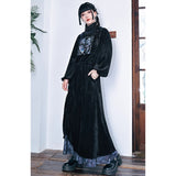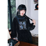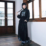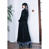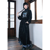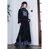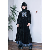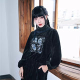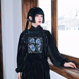 深いブラックのベルベット調生地が放つしっとりとした光沢と重みのある質感が印象的なハイネックトップス。首元には柔らかく立ち上がるリブタートルが寄り添い、肩から袖にかけてはゆったりと膨らむシルエットが優雅な落ち感を描く一着です。胸元には闘魚・ベタの刺繍が鮮烈に浮かび上がり、揺らめく長いヒレや躍動する姿がブルーを基調とした繊細な糸で描かれ、静寂の中に秘めた激しさを纏うような存在感を放っています。さ肩に添えられたリボンが柔らかいアクセントとなり、クラシカルでどこか幻想的なムードを纏わせています。