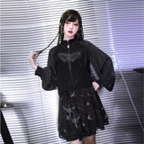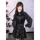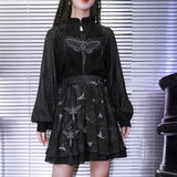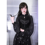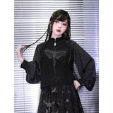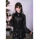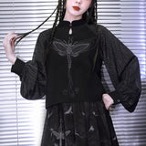 深い黒に静けさを湛えた、詩的なチャイナトップス。胸元には大胆に刺繍された昆虫のモチーフが浮かび上がり、まるで夜の静寂にひっそりと現れた標本のような美しさ。首元は控えめな立ち襟に小さな涙開きが添えられ、端正な佇まいの中にほのかな色気を宿しています。気品と神秘が静かに交差する、東洋的で儚い一着。