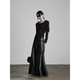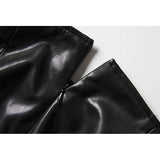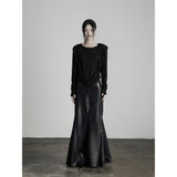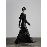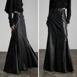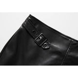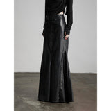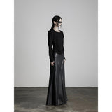 エッジの効いたクールな印象のブラックレザースカート。マキシ丈のAラインシルエットで、全体的にモードな印象を与えるデザイン。縫い目の切り替えが施されていることで立体感が生まれています。また、ウエスト部分には装飾バックルがついており、ディテールへのこだわりが感じられます。