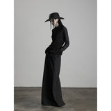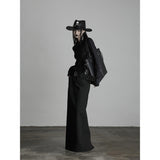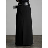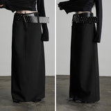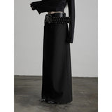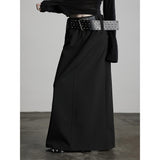 クールでモードな雰囲気を演出してくれるロング丈のスカート。すとんとした縦のラインを強調したアイテム。なめらかで重厚感のある生地が、エッジの効いた印象を与えます。シンプルなシルエットながらも、スタッズ付きの幅の広いベルトがアクセントになっています。