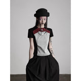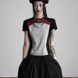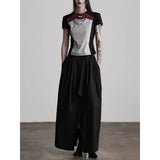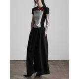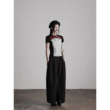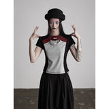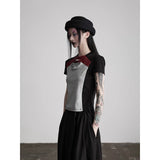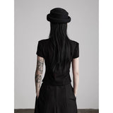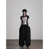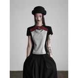 未来的な実験性とストリートエレガンスが融合したデザインが印象的なTシャツ。フェイクのミニTシャツがレイヤードされたようなディテールが施され、ユニークな立体感が視線を引き寄せます。アヴァンギャルドな雰囲気を醸し出しているアートピースのような一着。