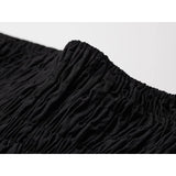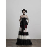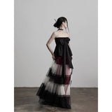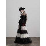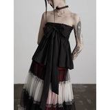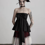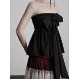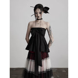 ゴシックロマンを纏うようなブラックのビスチェトップス。肩紐のないチューブトップ型で、胸元に大きく結ばれたリボンが印象的。裾にかけてフレアに広がるラインで、まるで少女の夢と退廃が交錯する舞台衣装のようです。耽美的な幻想世界の住人を思わせる装いとなっており、日常からかけ離れた美学を体現しています。
