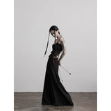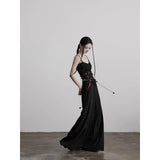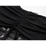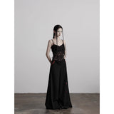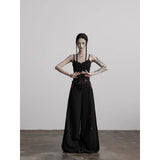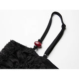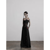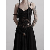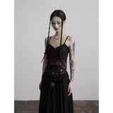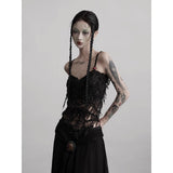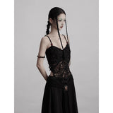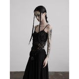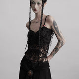 編み込まれたような布地が妖しく透ける、アートピースのようなゴシックメッシュキャミソール。黒い羽根を手作業で重ねたような独特のテクスチャが、身体に絡みつくように構築され、ところどころの透け感がミステリアスで挑発的。芸術的かつアバンギャルドな雰囲気を放つ一着。