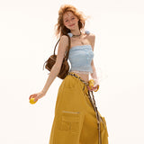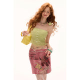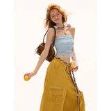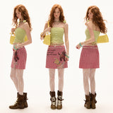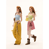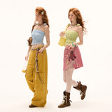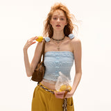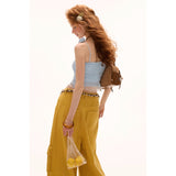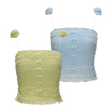 爽やかでガーリーな印象を与えるシャーリングキャミソール。胸元に小さなリボン、肩紐には薔薇の花が装飾されています。伸縮性のあるシャーリング加工でボディラインに優しくフィットします。裾のメロウフリルがアクセントとなり、フェミニンかつ遊び心のあるデザイン。軽やかで夏らしいムードを演出しています。