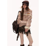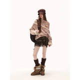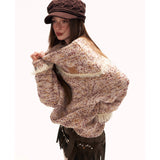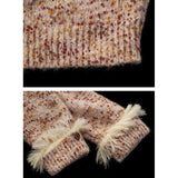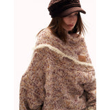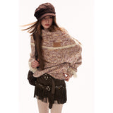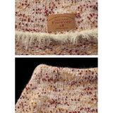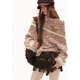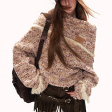 ベージュを基調にブラウンやマスタードが点描のように混ざり合った、秋冬の空気をそのまま編み込んだようなセーター。肩から斜めに走る切り替えには、やわらかなフリンジのラインが添えられ、少しだけ崩したようなアシンメトリーの構成が、無造作でいて計算された佇まいを生み出しています。