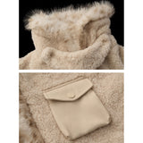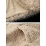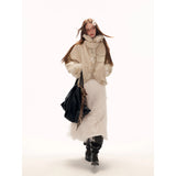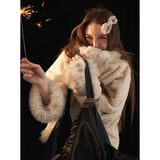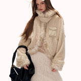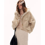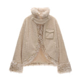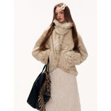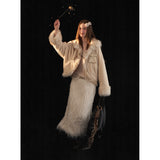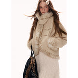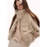 柔らかな生成り色のボアが全体を包み込み、触れた瞬間に冬の空気を溶かすような温もりを感じさせるジャケット。首元に沿って立ち上がるボリュームのあるネックラインと、前立てや袖口にあしらわれた淡い斑点模様のファーが静かなアクセントとなっています。肩から身頃にかけては丸みを帯びたシルエット。クラシカルでありながらどこか幻想的な印象をまとっています。