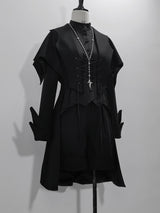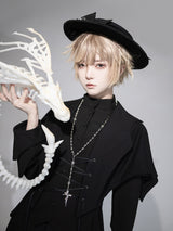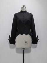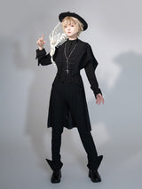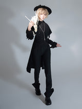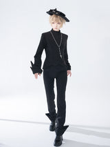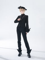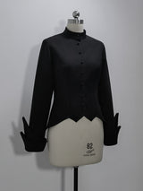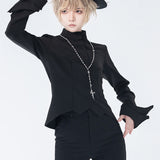 袖口が折り返され、裾部分はギザギザと刻んだようなデザインのハイネックなブラウス。ボーイッシュな雰囲気が漂うアイテムです。同系色のパンツロングベストと合わせると、格調高き黒騎士みたいな雰囲気に。騎士物語の世界に誘われてみては。
