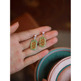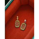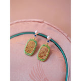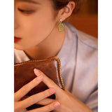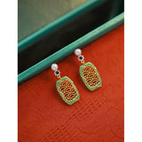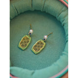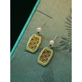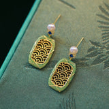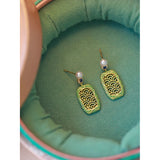 翡翠のような緑の縁取りに、金色の青海波文様が繊細に透かし彫りされた耳飾り。上部には小さな瑠璃と真珠が添えられ、東洋の美意識と雅が香る、凛とした静けさを湛えたアイテム。