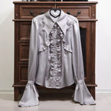 滑らかな光沢をたたえた生地に、胸元から縦に流れるフリルが静かなリズムを刻むブラウス。波打つような大きめの襟が印象的。肩から袖にかけては程よく丸みを持たせたラインが続き、手元でふわりと広がるベルスリーブが、動くたびに優雅な余韻を残します。全体としては端正でありながらどこか耽美的な気配を纏ったアイテム。