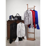 滑らかな光沢をたたえた生地に、胸元から縦に流れるフリルが静かなリズムを刻むブラウス。波打つような大きめの襟が印象的。肩から袖にかけては程よく丸みを持たせたラインが続き、手元でふわりと広がるベルスリーブが、動くたびに優雅な余韻を残します。全体としては端正でありながらどこか耽美的な気配を纏ったアイテム。