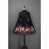 洗練された狂気と美を内包する、演劇的で中世幻想的なジャンパースカート。髑髏・薔薇・砂時計・宝石・鏡などが織り込まれ、まるで暗黒の魔術師の書斎を思わせる幻想的な挿絵が広がっています。サスペンダーラインがコルセットのように身体を包み込み、背面では編み上げが施されています。ウエストからふわりと広がるスカートにはレースを重ねています。耽美と退廃の香りを漂わせる舞台衣装のような雰囲気を醸し出しています。