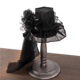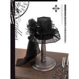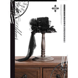既成の道徳や秩序に対する本能的な反発者をテーマにしたミニハット。繊細なレースやブレードで縁取られ、周囲をフリルが取り囲み、華やかでドラマティックな雰囲気を放っています。サイドには大きな布花と軽やかなメッシュヴェールが流れるように垂れ、優雅で妖艶な印象を添えています。アンティーク調の装飾性とゴシックロリータの世界観を併せ持つ、舞台衣装のように存在感のある装飾帽子。