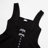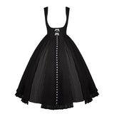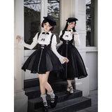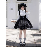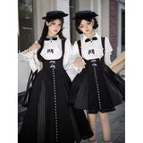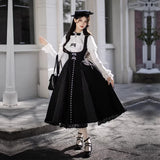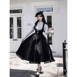 白と黒のコントラストを主旋律に据えた、ピアノの鍵盤をそのまま衣服に落とし込んだようなジャンパースカートとブラウス。ブラウスは白鍵を思わせる白を基調に、細かなフリルや立体的な胸元の装飾が音の立ち上がりのような雰囲気を醸し出しています。ジャンパースカートは深い黒を基調に縦へ流れる切り替えやピンタックが黒鍵の規則正しい並びを想起させ、歩くたびにリズムを刻むようなシルエットを描きます。楽譜の上を指が滑る瞬間の緊張感と美しさを纏った、知的でクラシカルな佇まい。