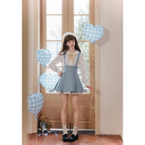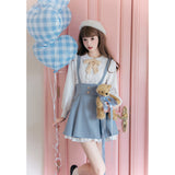 胸を弾ませて出かけたあの頃の姿を思い出させてくれるようなストラップスカートとブラウス。ストラップスカートは裾の内側にはレースの装飾が施され、細部まで可愛さたっぷり。ブラウスは、可愛らしい丸襟となっており、前立て部分にはたっぷりのフリルが施されています。何気ない日常にときめきを。