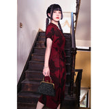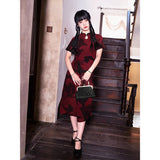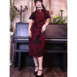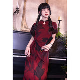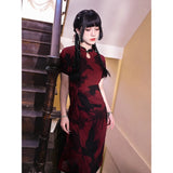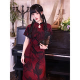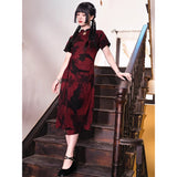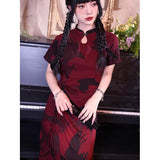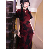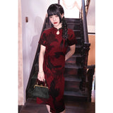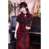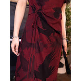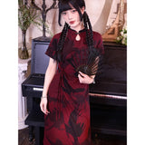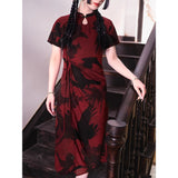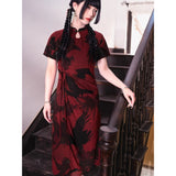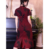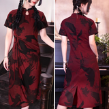 終焉を誘う羽音が聞こえてくるみたい。 黒い羽と鋭い眼差しを纏った鴉を描いたチャイナワンピース。夕闇を彷彿とさせる艶やかなボルドーに、黒い鴉が描かれており、どこか幻想的でドラマチックな雰囲気を漂わせます。ウエストは片側をドローストリングで絞るデザインになっており、くびれを美しく強調します。東洋美を感じさせつつも、現代的に洗練された印象を放っています。