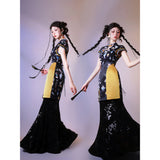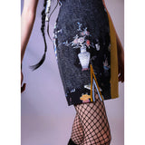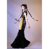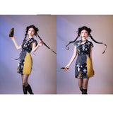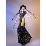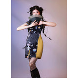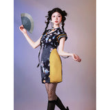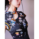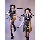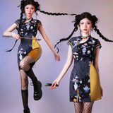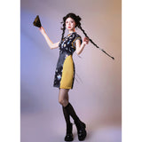 陶器や書物、盆栽など、古代の器物が大胆に描かれたチャイナワンピース。ショート丈のカッティングは、愛らしさとエレガンスを兼ね備え、ウエストのリボンデザインがシルエットを美しく引き立てます。立体的なパネル切り替え技術により、黄色と黒のコントラストがより鮮やかに際立ちます。