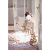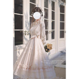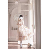 陽だまりの午後を思わせるアンティークロマンティックなジャンパースカートとフリルリボンブラウス。ジャンパースカートはアイボリー地に繊細なフリルとレースを幾重にも重ね、柔らかな光を纏うようなテクスチャーが特徴的。リボンベルトがウエストを優しく結び、クラシカルなシルエットを描きます。ブラウスは高めのフリル襟とピンタックをあしらい、袖口にはギャザーを寄せた上品なボリューム感。19世紀の令嬢が午後の庭園をそっと歩くような、静謐で詩的な気品が漂います。