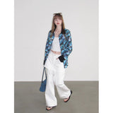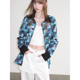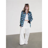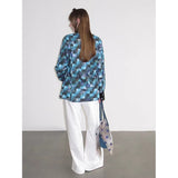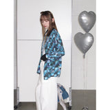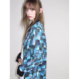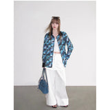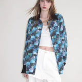 海と空が溶け合うように広がる深いブルーの風景と、その上に静かに映る花の影を映し取ったシャツ。幾重にも重なったブルーの色彩は、光の角度によって表情を変える海面や、夕暮れに近づく空のグラデーションを思わせ、その上に浮かび上がる花のシルエットは、水面やガラス越しに映る花の影のようにやわらかく漂っています。モザイクのように重なる色の断片は、風に揺れる水面や雲の流れを切り取った瞬間のような奥行きを生み出し、見る角度によって異なる景色を感じさせます。