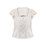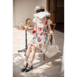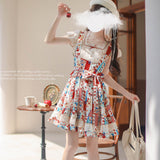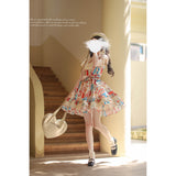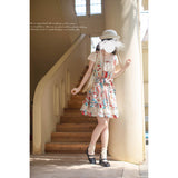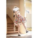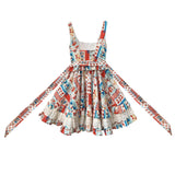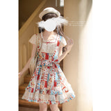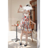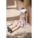 綿絵本の世界に迷い込んだような世界観のアイテム。ジャンパースカートには、レトロで可愛らしいパッチワークのイラストが描かれており、スカート部分はふんわりと広がるフレアデザインで、ロマンティックな印象を与えます。トップスは、フロントのレースやリボンの装飾がガーリーな雰囲気を引き立てます。