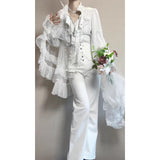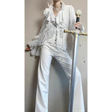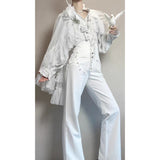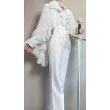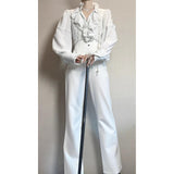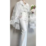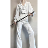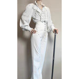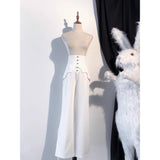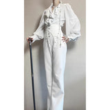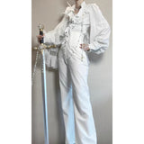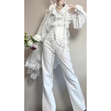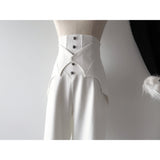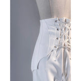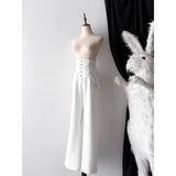 コルセットのようなウエストデザインを組み合わせた、エレガントかつ構築的なシルエットが特徴的なロングパンツ。フロントに並ぶボタンと湾曲した切り替えがウエストラインを美しく強調し、バックにはレースアップが施されていることで後ろ姿までドラマティックに仕上がっています。