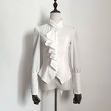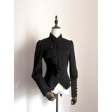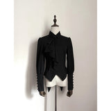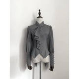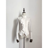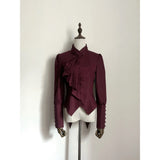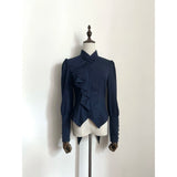 しなやかな曲線を描くアシンメトリーなフリルが胸元に流れ落ちるブラウス。肩はほんのりと丸みを帯び、袖口にはくるみボタンがずらりと並んでいます。ウエストラインは鋭くカットされたシルエットで、優雅さと構築美がひとつに重なっています。
