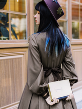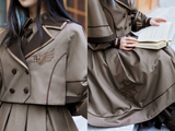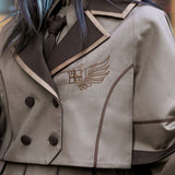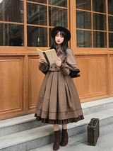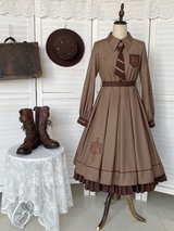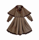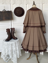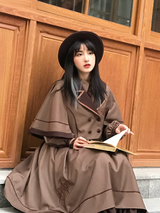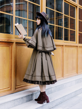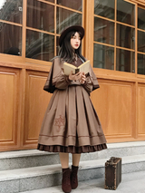 胸元と裾部分に剣形の徽章が刺繍された文学クラシカルなワンピースとケープ。ケープはダブルブレストのデザインとなっており、比較的ゆったりとしたシルエットで、バックはリボンで結べるようになっています。格調高き文学少女に。