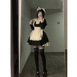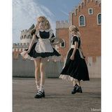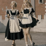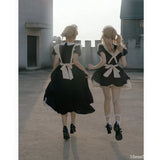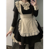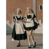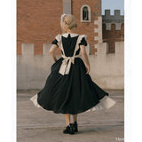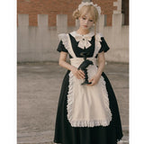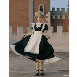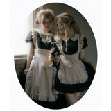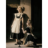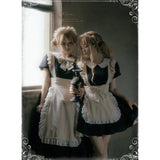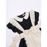 メイド気分を謳歌してみて。レース刺繍が装飾されたエプロンが組み合わせられたワンピース。ロング丈とショート丈の2種類ご用意しております。付け袖を合わせると、長袖にもなります。ふわりと膨らむスカート部分が愛らしい雰囲気を演出してくれる。