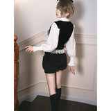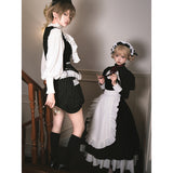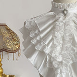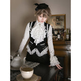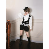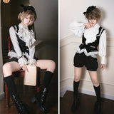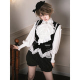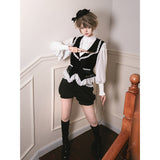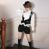 格調高き執事みたいに演出してくれるブラウスとベストとハーフパンツ。ブラウスには存在感のあるジャボがついており、ベストには白地のレース刺繍が装飾されています。ボーイッシュな雰囲気たっぷりのアイテム。物語の世界に誘われてみて。