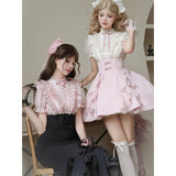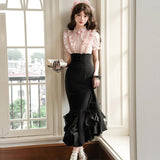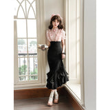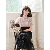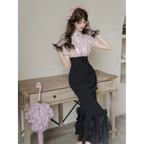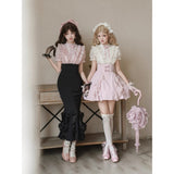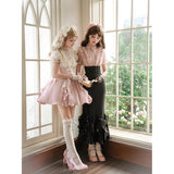 優雅で知的な印象に演出してくれるロング丈のドッキングワンピース。繊細なパフスリーブのブラウスと、優美に広がる黒のマーメイドスカートが一体となったデザイン。ライトピンクの身頃にはたっぷりのフリルが施され、ハイウエスト位置で切り替えられたブラックのマーメイドスカートは流れるような美しいラインを魅せてくれる。裾にはボリューム感あるラッフルフリルを施し、エレガントな動きを演出します。クラシカルなロリータ要素とドールのような可憐さを融合した、愛らしさ全開の主役級スタイル。