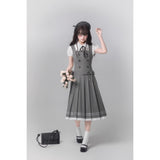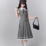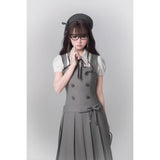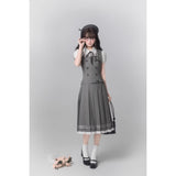 少女らしい可憐さと知的な雰囲気を同時に感じさせるロング丈のジャンパースカートとブラウス。落ち着いたチャコールグレーで仕立てられたジャンパースカートは、上身頃をすっきりと包み込むコンパクトなシルエットにダブルボタンが整然と並び、クラシカルで端正な印象を与えながらも、裾へと続く細かなプリーツが軽やかな広がりを生み出すデザイン。ウエスト脇には小さなリボンと星のチャームがさりげなく揺れ、控えめな甘さを湛えています。裾には繊細なレースが重ねられ、歩くたびにほのかにのぞく白がコントラストを描き、全体をやわらかくまとめ上げています。ブラウスはふんわりと丸みを帯びたパフスリーブと小ぶりな襟元が愛らしく、胸元には細いリボンタイが結ばれて上品なアクセントとなっています。