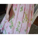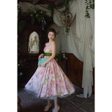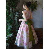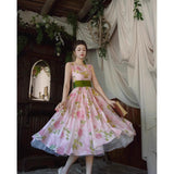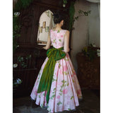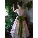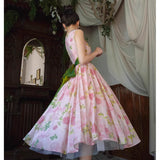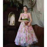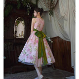 咲き誇る桃色の菊の花々が、柔らかで優美な印象を演出してくれるワンピース。1950年代の優雅さを受け継ぎながら、色褪せない美しさを放つアイテム。スカートは三重構造で、表地と裏地の間にはソフトな白いチュールが一層プラスされており、スカートにボリュームを出しつつ、美しいシルエットを醸し出してくれる。深みのあるグリーンの大きなリボンベルトがウエストを引き締め、後ろ姿にも華やかさをプラスします。華やかでロマンティックな雰囲気を纏ってみて。