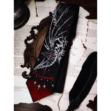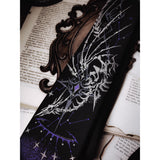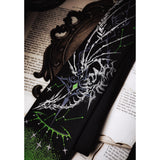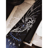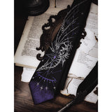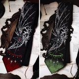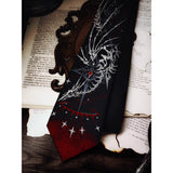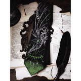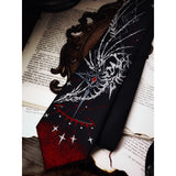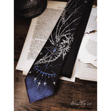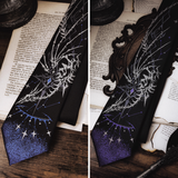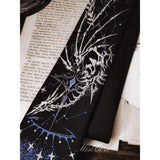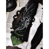 幻想的かつダークな世界観のネクタイ。黒を基調とした生地には、銀色の骨格を思わせる複雑な紋様が描かれており、それはあたかも宇宙空間に浮かぶ神秘的な骸骨のように見えます。背景には星座のような星の点描と、下部には放射状に広がる円盤状のモチーフが配されており、それはまるで異なる惑星や次元を表現しているかのよう。